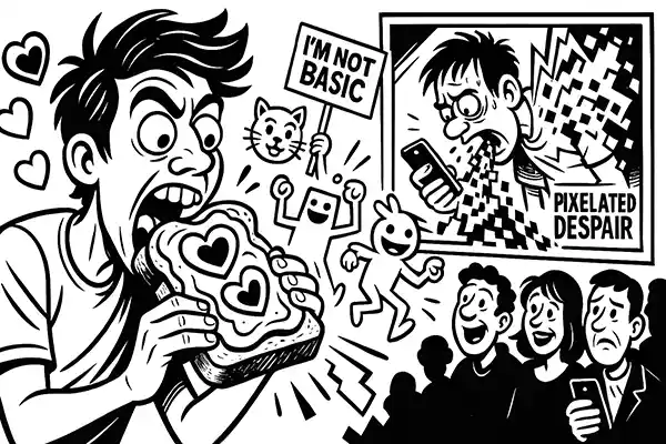 Your avocado toast ain’t food ‘til it’s got more likes than a viral cat vid. Algorithm dances, “I’m not basic” filters, and doomscrolling ‘til you puke – we’re blending it into a comic: your story explodes, leaving you with pixelated despair. Audience laughter? Cringe, like liking your ex’s post!